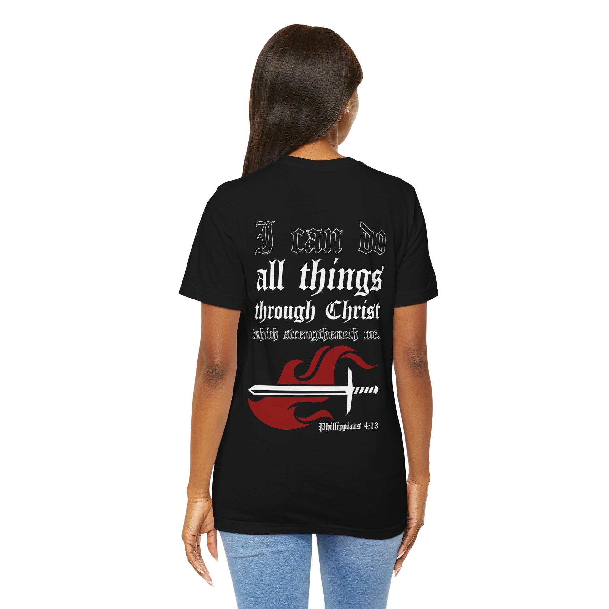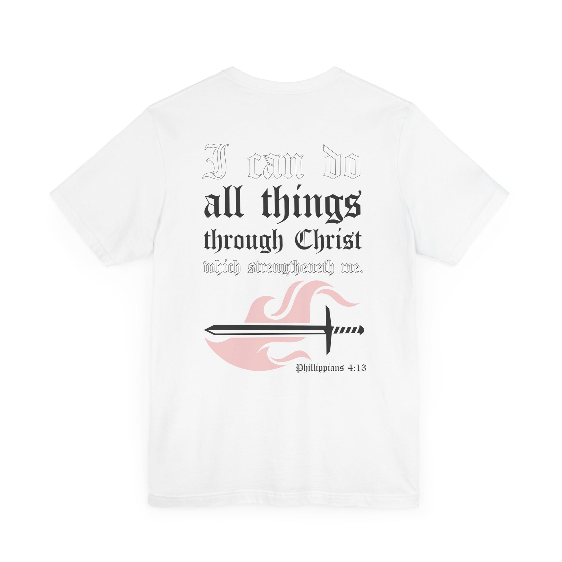 A unisex jersey short sleeve tee featuring a design with a verse from Phillippians 4:13. This t-shirt is made with 100% Airlume combed and ring-spun cotton, making it lightweight, breathable, and perfect for active and leisure wear. The retail fit and crew neckline give it a classic and neat style, suitable for casual and semi-formal settings. It is relevant to Christian holidays and celebrations.